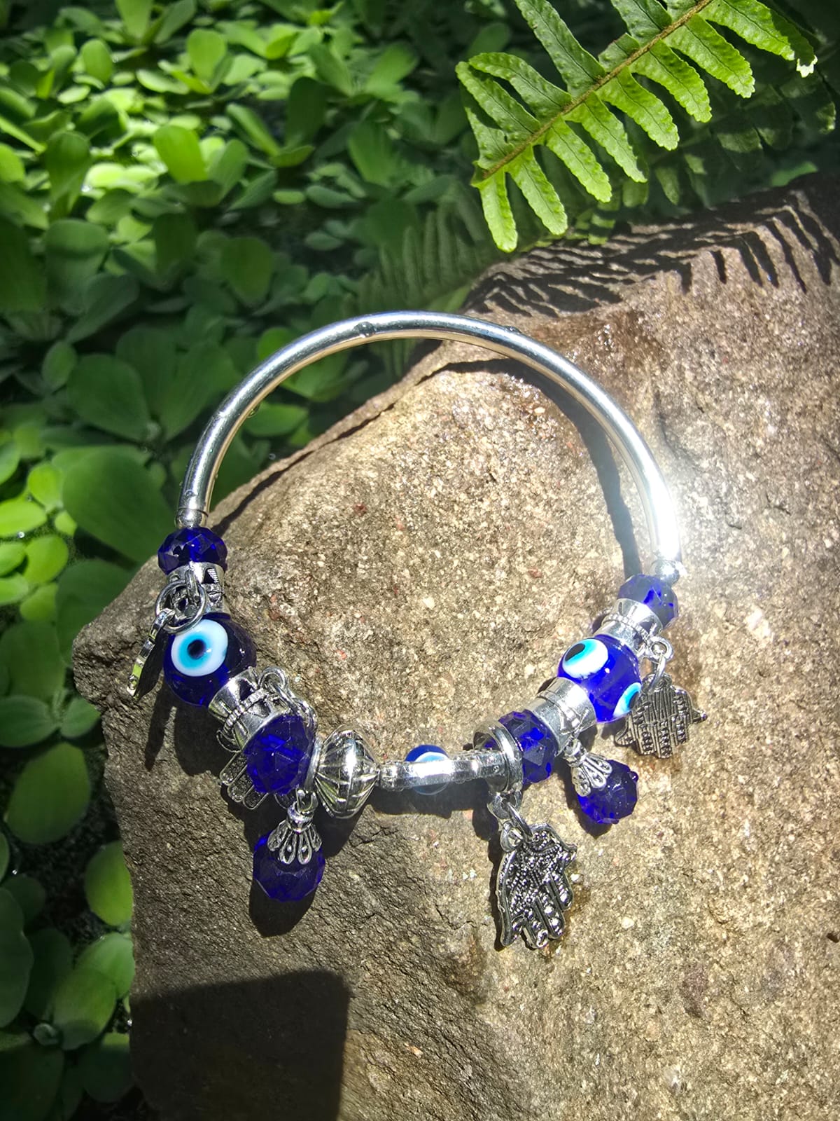 This beautiful evil eye bangle with charms is designed to deflect negativity while inviting peace, balance, and good fortune. Each charm moves freely, symbolizing constant protection wherever you go.
